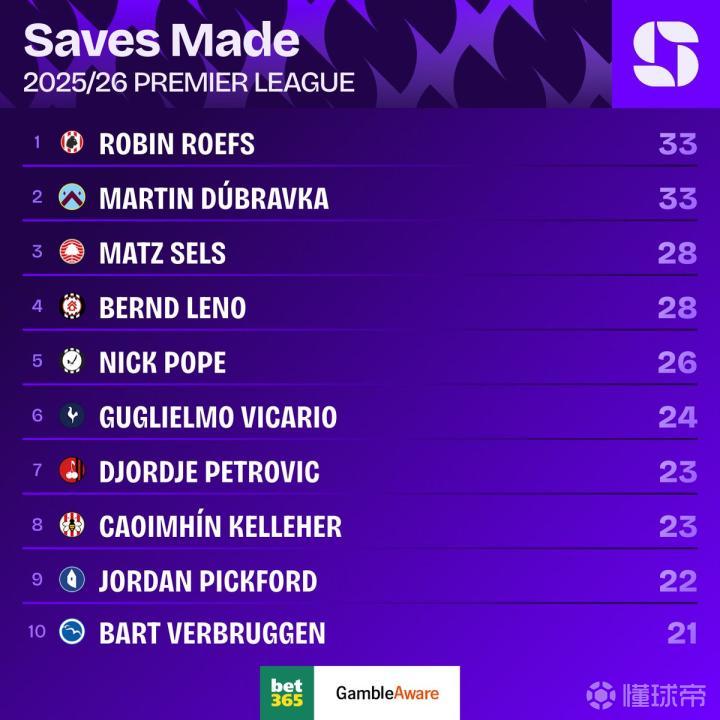 此外,在处理高空球方面,罗埃夫斯亦以14次的数据并列联赛榜首(另一位为纽卡守门员波普)。本赛季迄今,罗埃夫斯已实现4场零封对手,成功扑救1次点球,且依据其面对射门的质量评估,为球队减少了约2.94个预期失球。