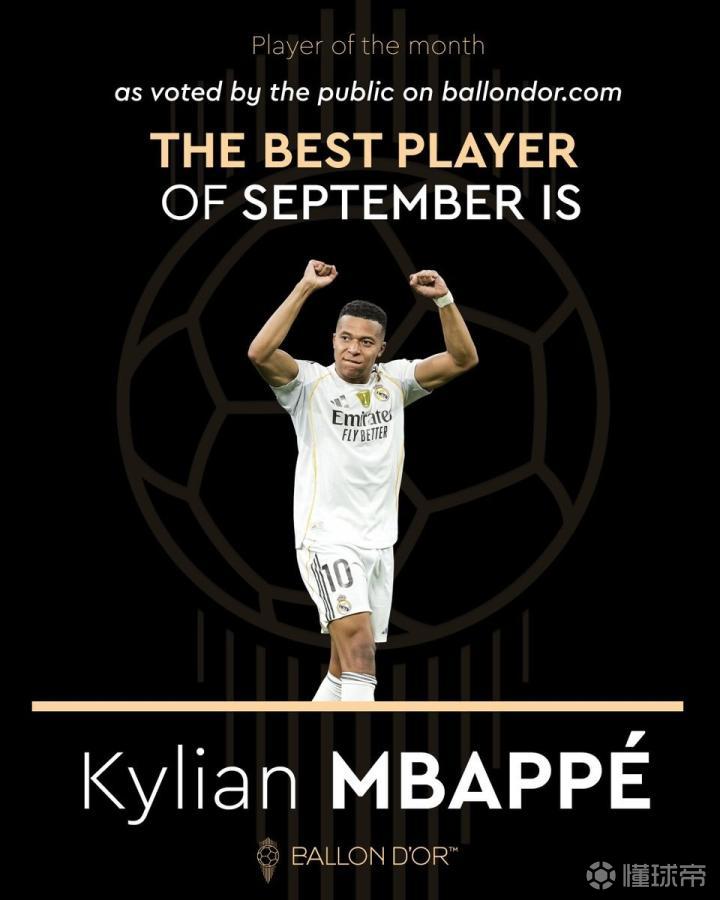 官方发布消息,姆巴佩荣膺金球奖9月最佳球员称号。